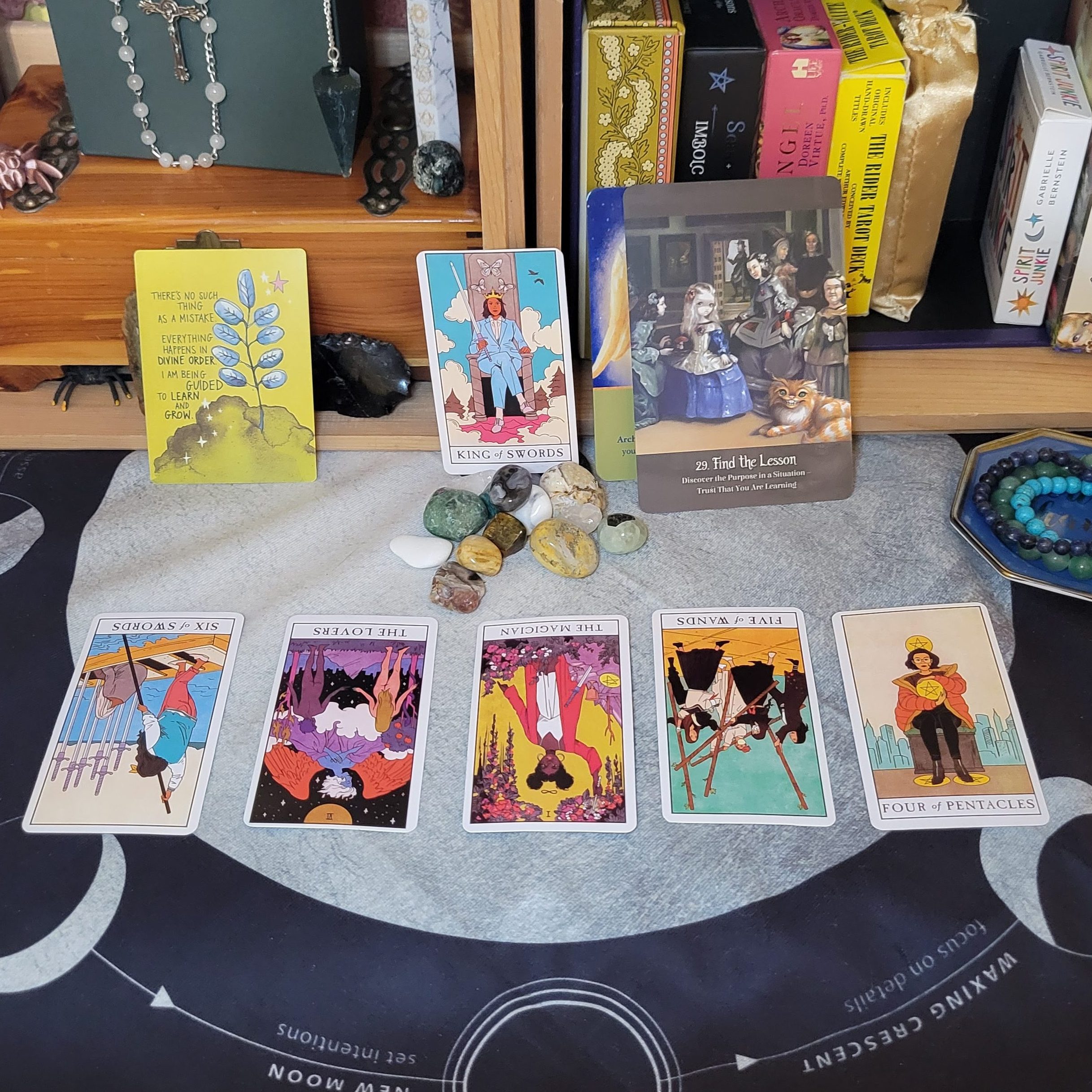 My Altar with Tarot Spread: Six of Swords Reversed, The Lovers Reversed, The Magician Reversed, Five of Wands Reversed, Four of Pentacles, and the King of Swords (placed as my anchor card on a stack of my crystals). The deck used is “Modern Witch” by Lisa Sterle.